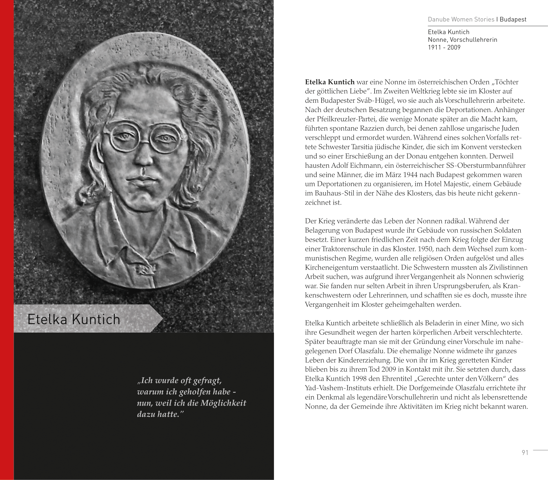Etelka Kuntich (1911 – 2009), war eine Nonne im österreichischen Orden Töchter der göttlichen Liebe. Im Zweiten Weltkrieg lebte sie im Kloster auf dem Budapester Sváb-Hügel, wo sie auch als Vorschullehrerin arbeitete. Nach der deutschen Besatzung begannen die Deportationen. Anhänger der Pfeilkreuzler-Partei, die wenige Monate später an die Macht kam, führten spontane Razzien durch, bei denen zahllose ungarische Juden verschleppt und ermordet wurden. Während eines solchen Vorfalls rettete Schwester Tarsitia jüdische Kinder, die sich im Konvent verstecken und so einer Erschießung an der Donau entgehen konnten. Derweil hausten Adolf Eichmann, ein österreichischer SS-Obersturmbannführer und seine Männer, die im März 1944 nach Budapest gekommen waren um Deportationen zu organisieren, im Hotel Majestic, einem Gebäude im Bauhaus-Stil in der Nähe des Klosters, das bis heute nicht gekennzeichnet ist.